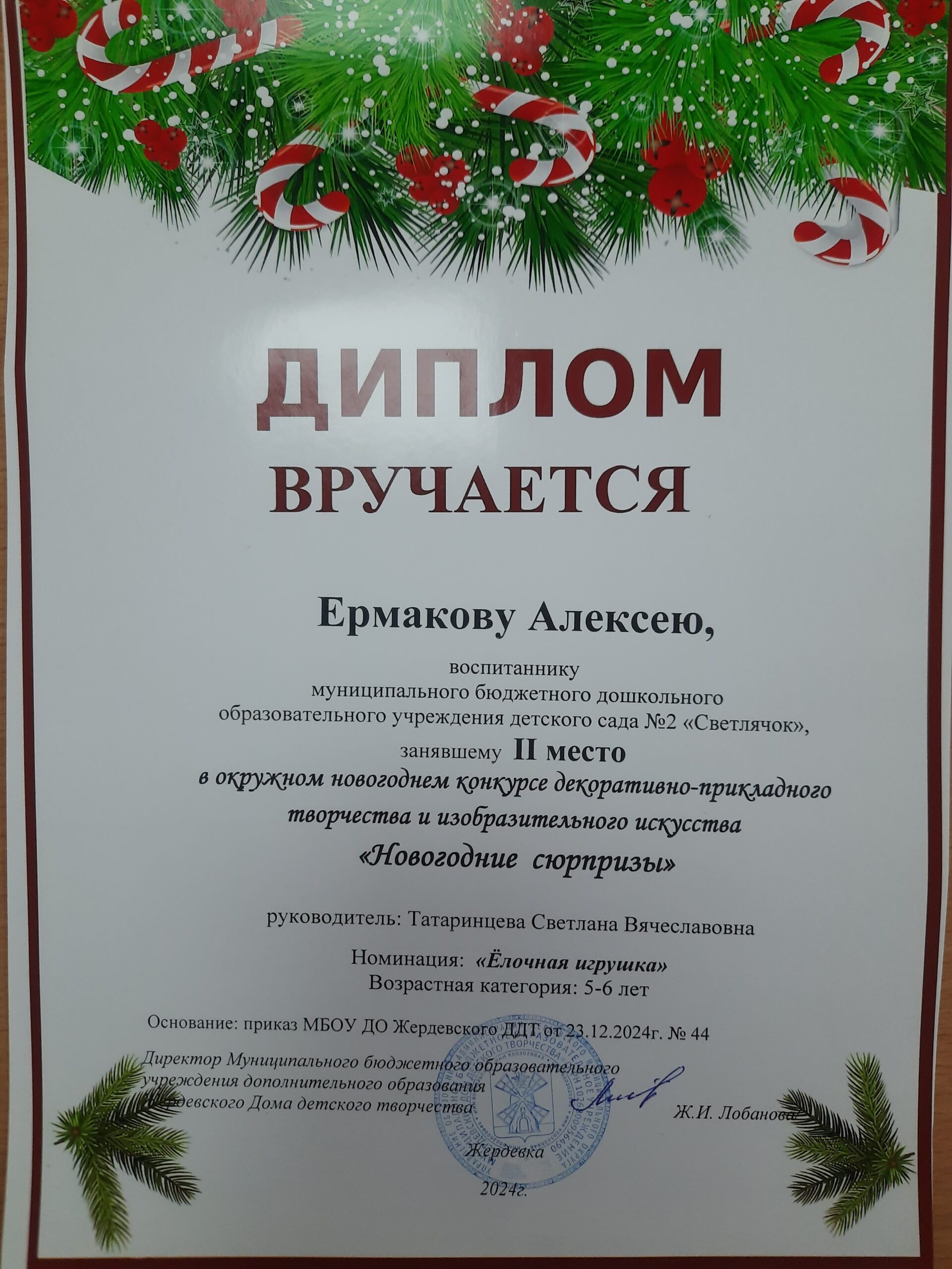 - Благодарственное письмо детскому саду №2 «Светлячок» за оказание безвозмездной помощи военнослужащим участвующих в СВО