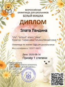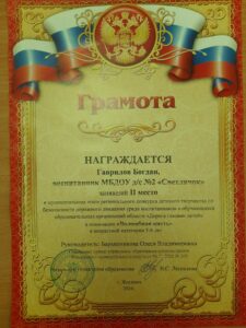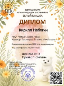 - Сертификат регионального этапа III Всероссийского конкурса профессионального мастерства «Лучшие няни России «