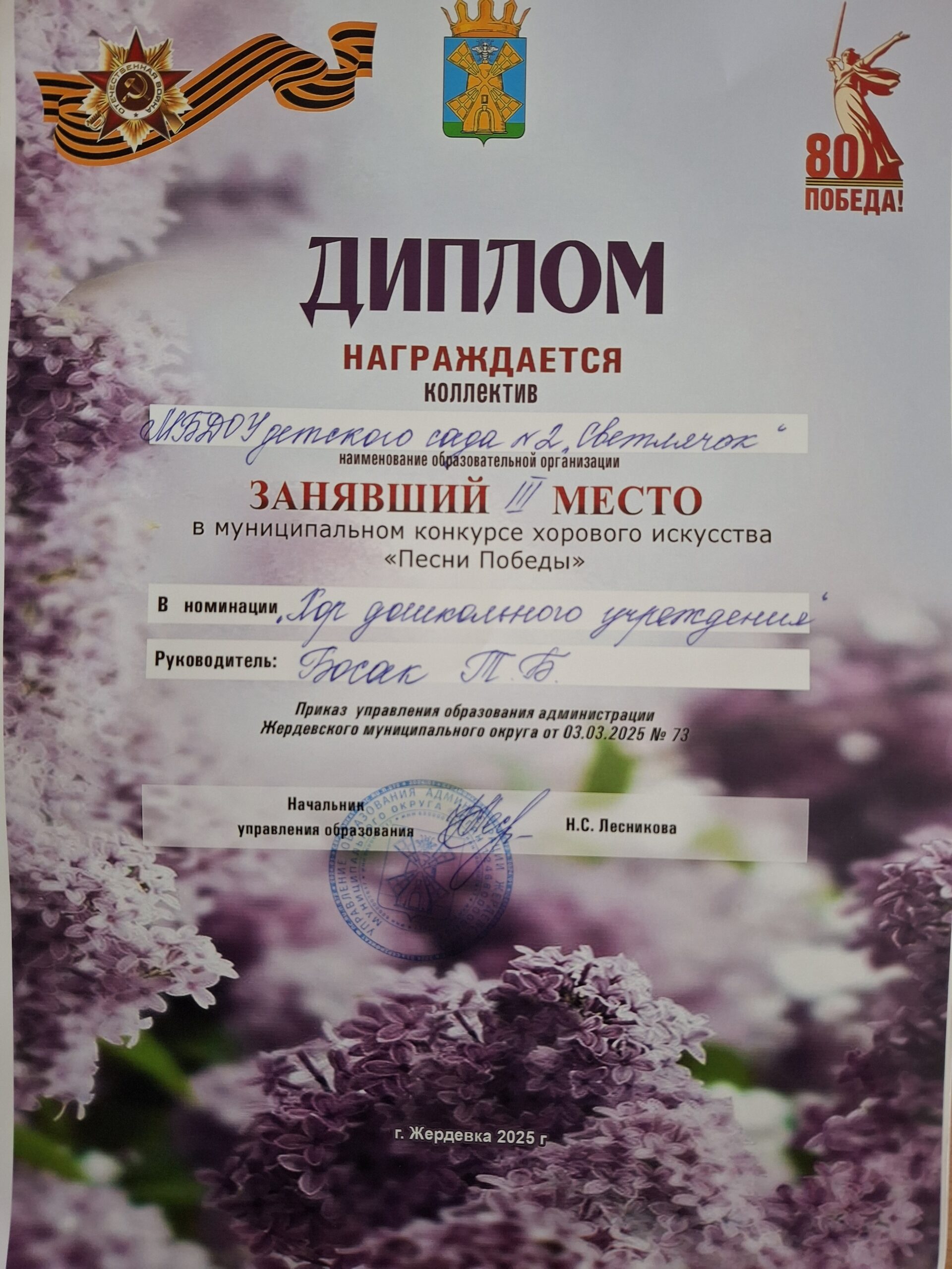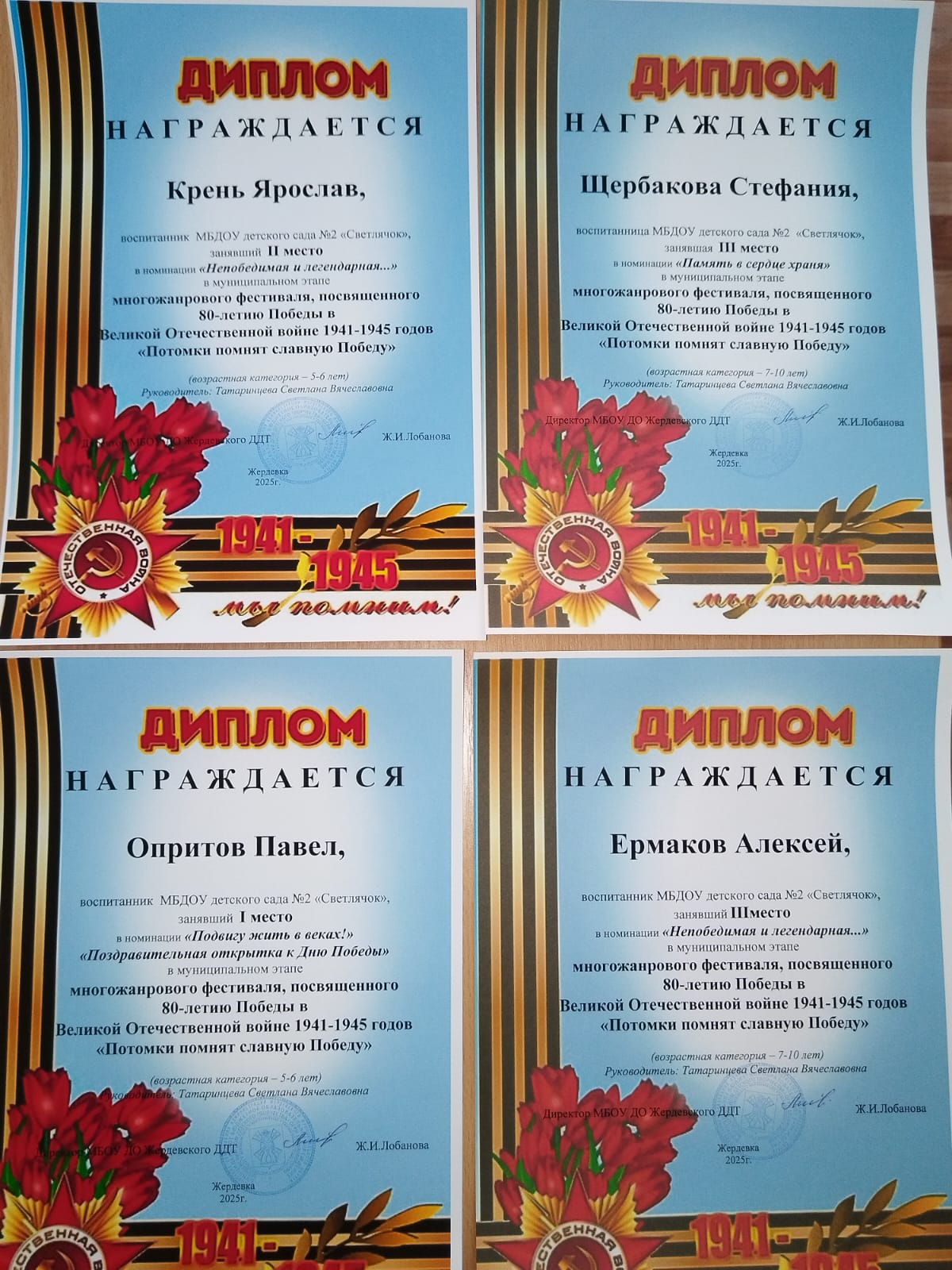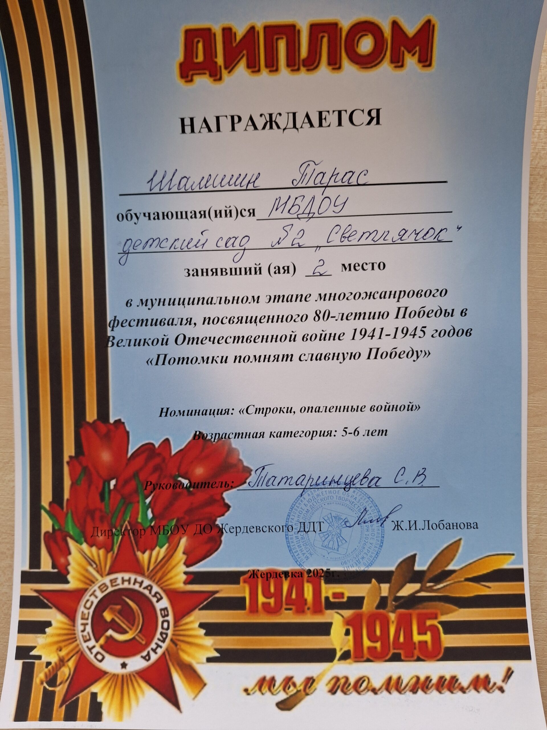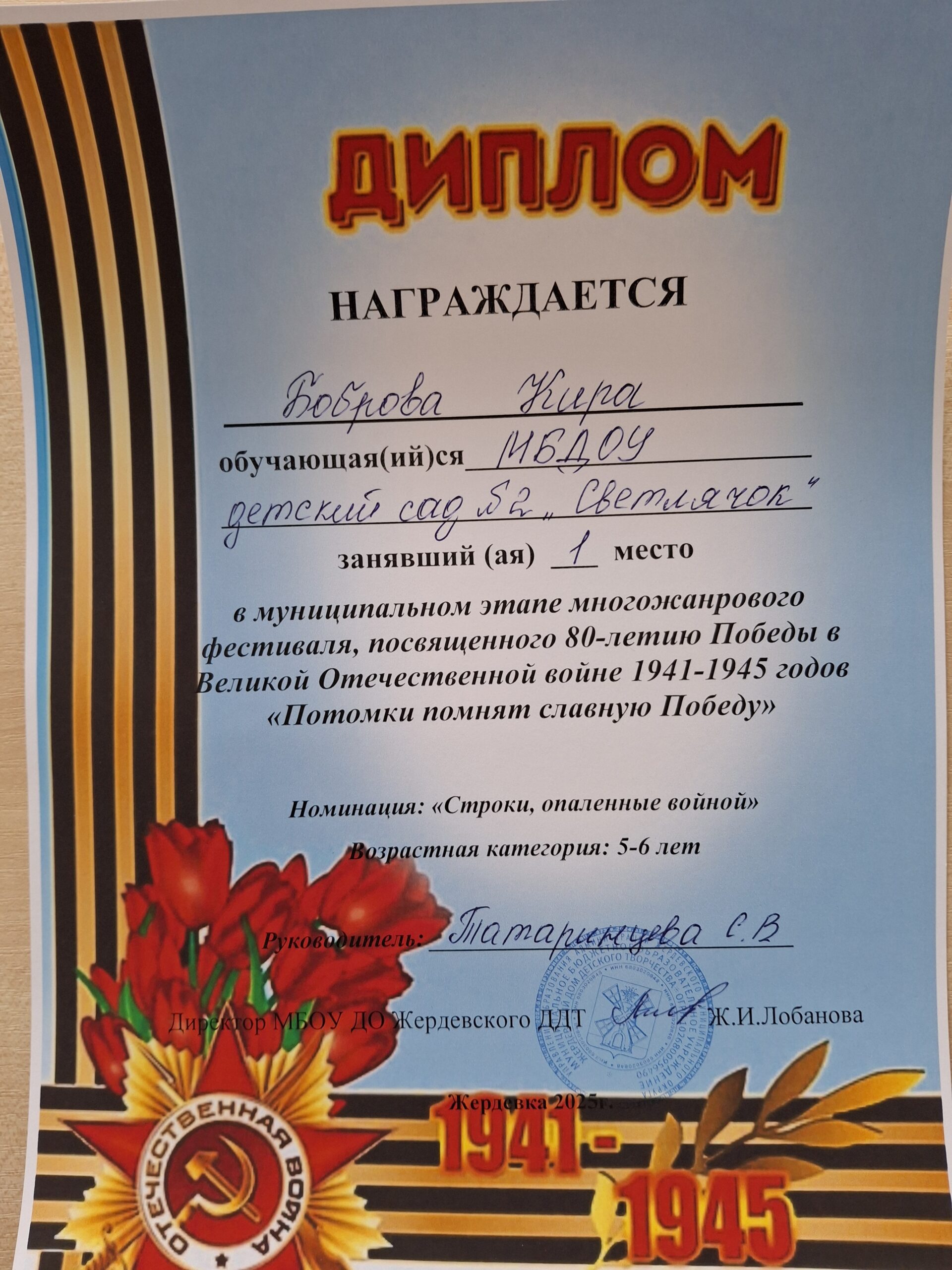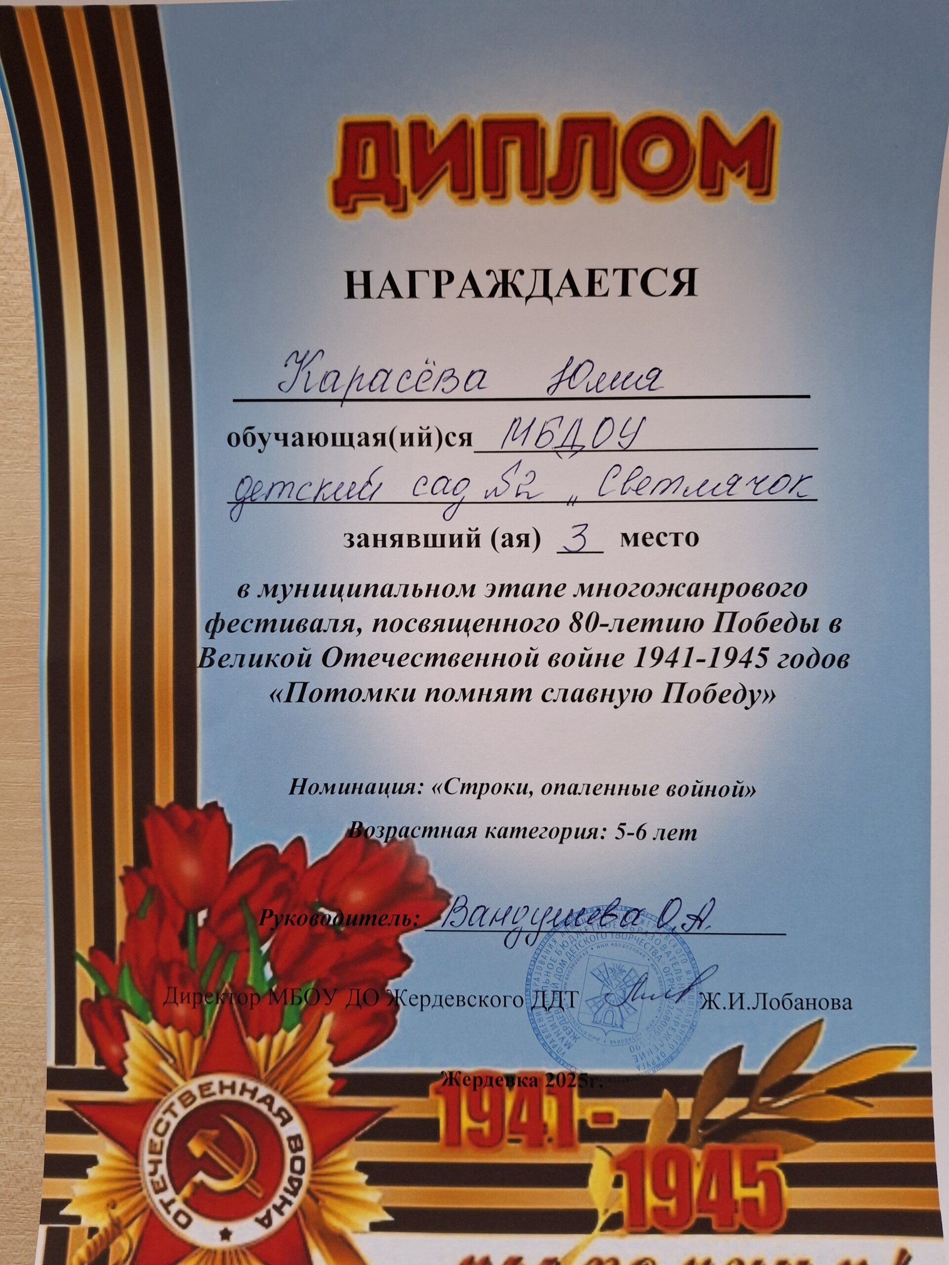 Муниципальный этап многожанрового фестиваля, посвященного 80 -летию Победы в ВОВ 1941-1945г «Потомки помнят славную Победу». Номинация «Строки, опаленные войной», «Непобедимая и легендарная…», «Память в сердце храня», «Подвигу жить в веках»