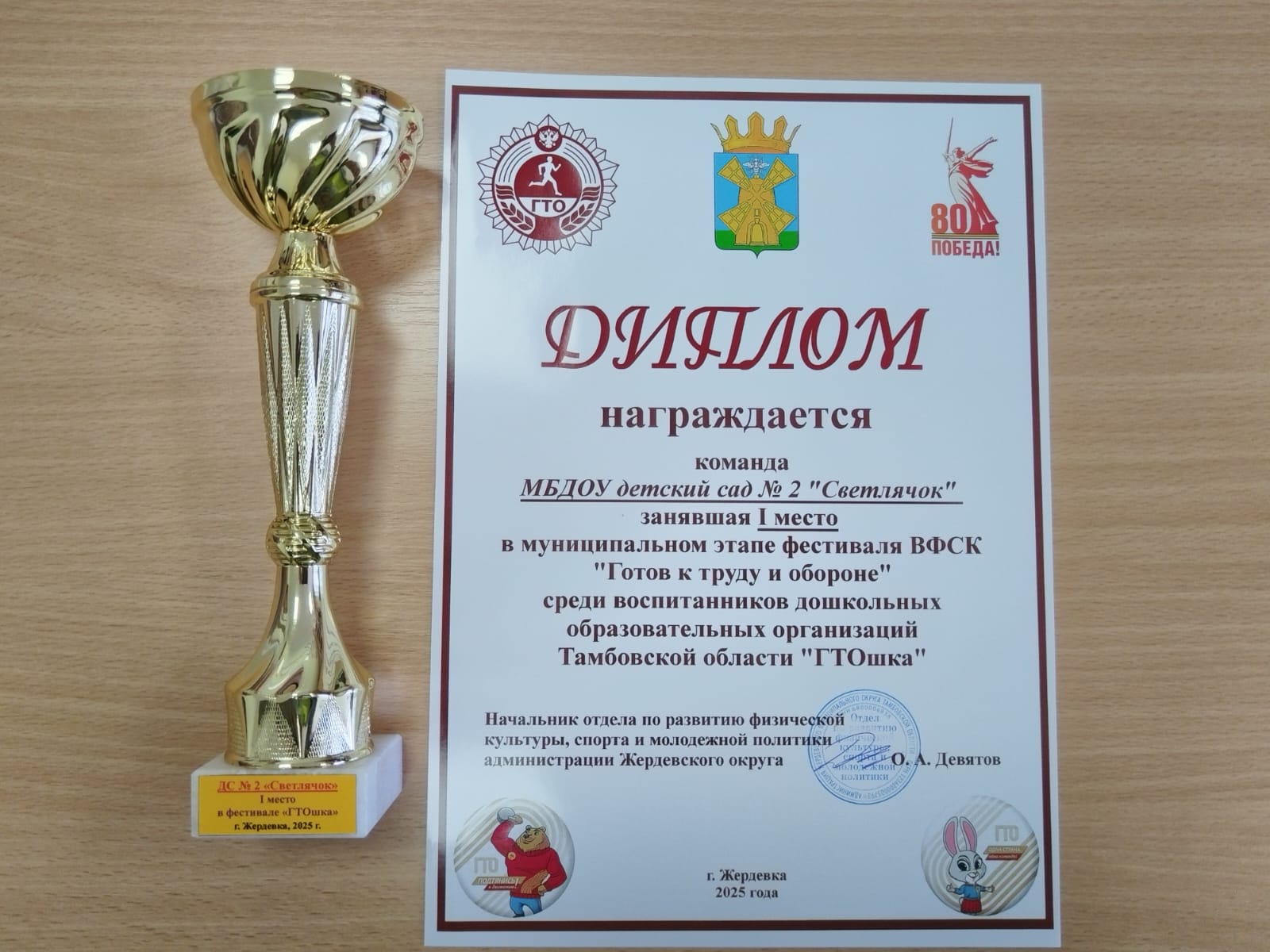 - «ГОТОВ К ТРУДУ И ОБОРОНЕ» Воспитанники детского сада приняли участия в муниципальном этапе фестиваля ВФСК «ГТОшка»,по результатам которого заняли 1 место среди воспитанников ДОУ