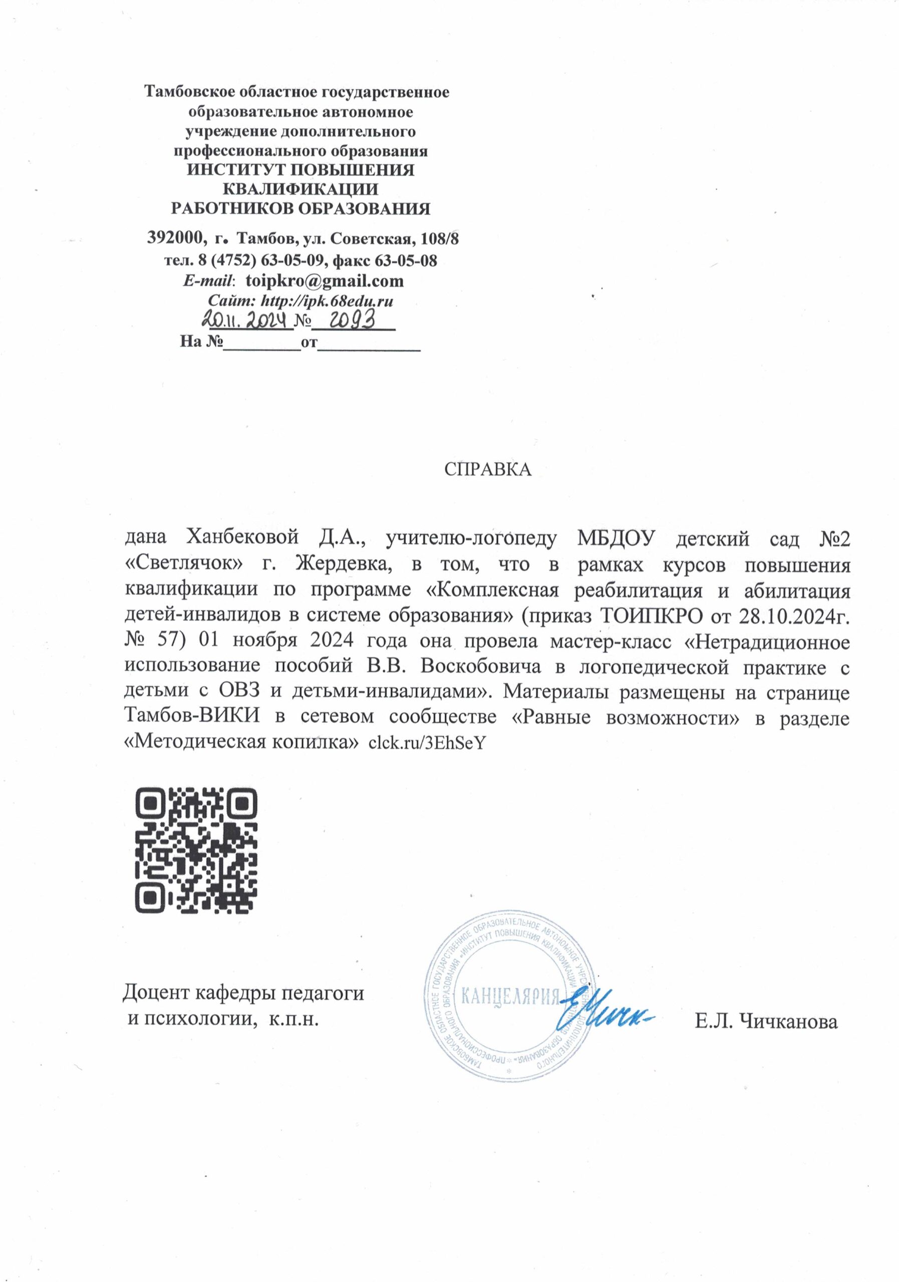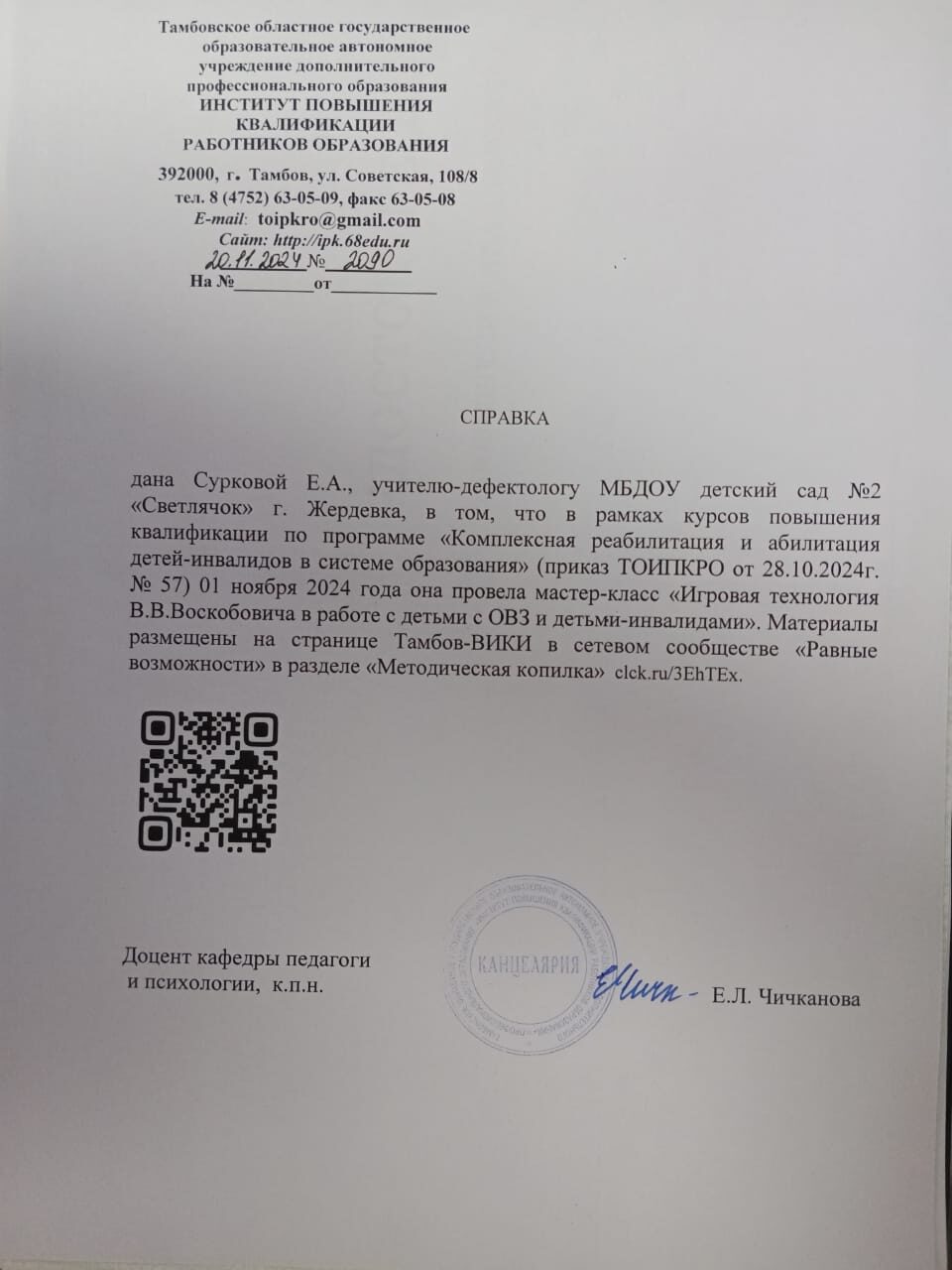 - 01.11.2024г Завершающим этапом курсов «Комплексная реабилитация и абилитация детей-инвалидов в системе образования» для специалистов стало выступление педагога — психолога, учителя — логопеда, учителя — дефектолога с мастер-классом на тему: «Развивающие игры В. В. Воскобовича в работе с детьми с ОВЗ и с детьми-инвалидами»