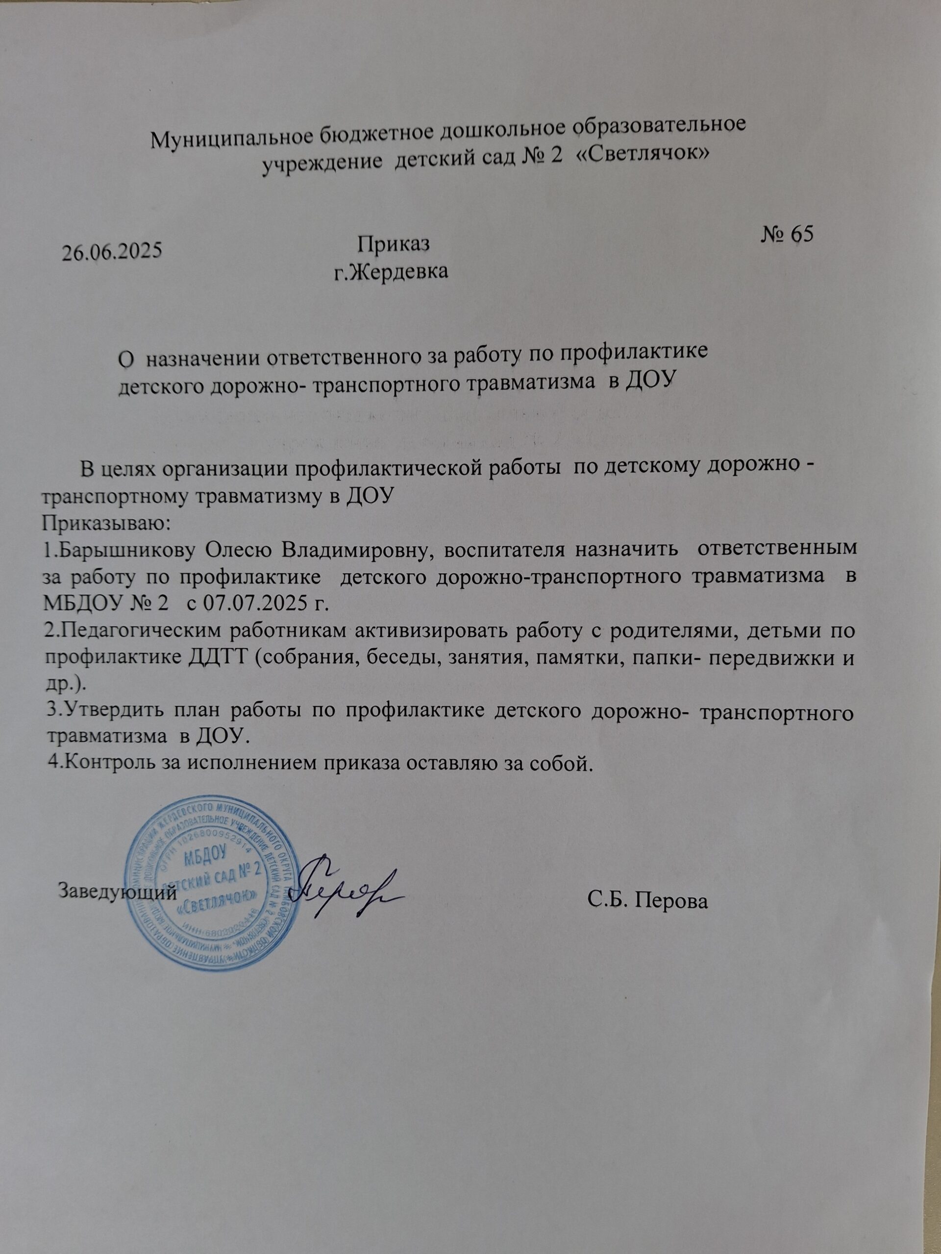 - Приказ 65 от 26.06.2025 О назначении ответственного за работу по профилактике детского дорожно- транспортного травматизма в ДОУ